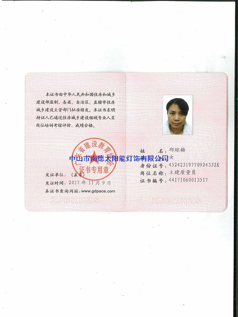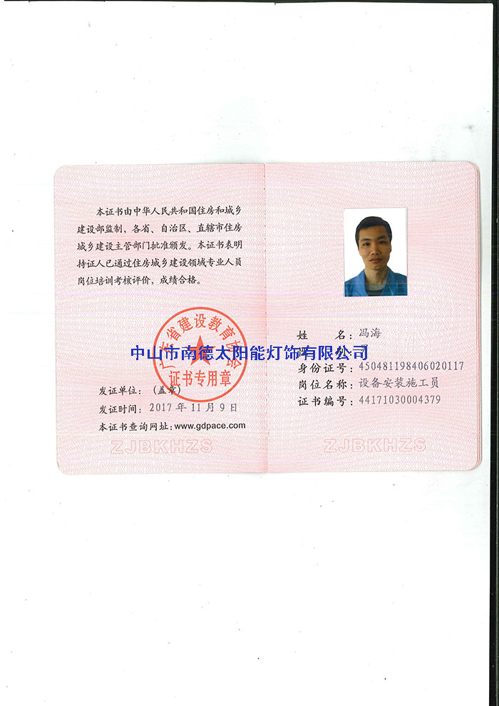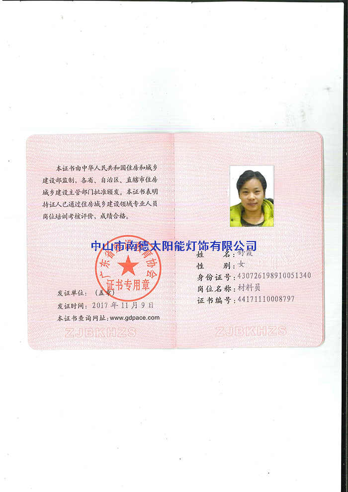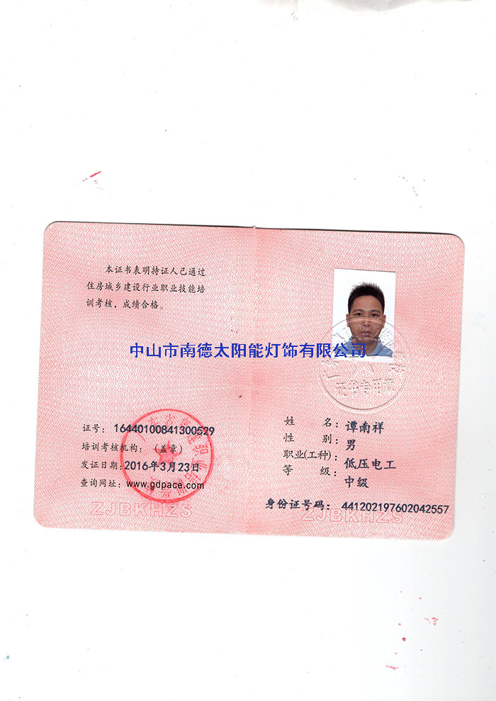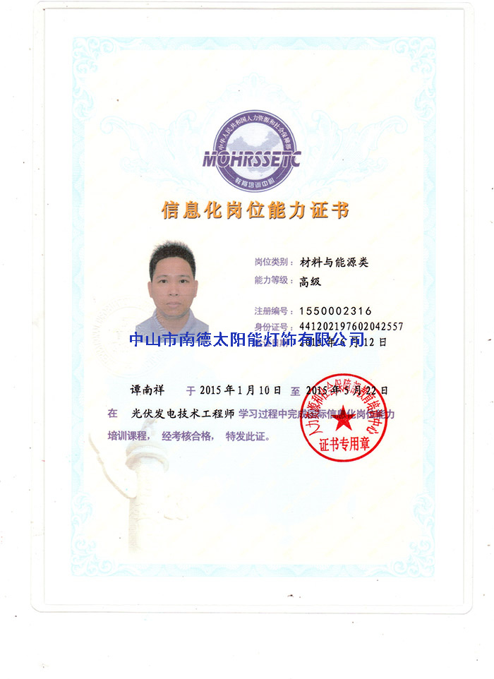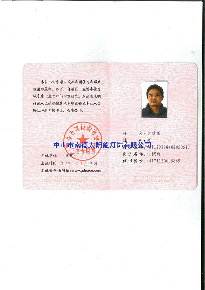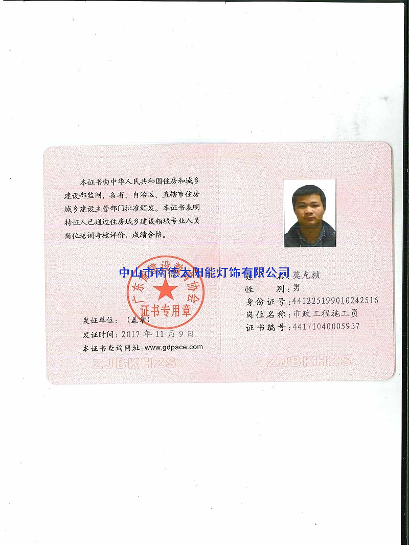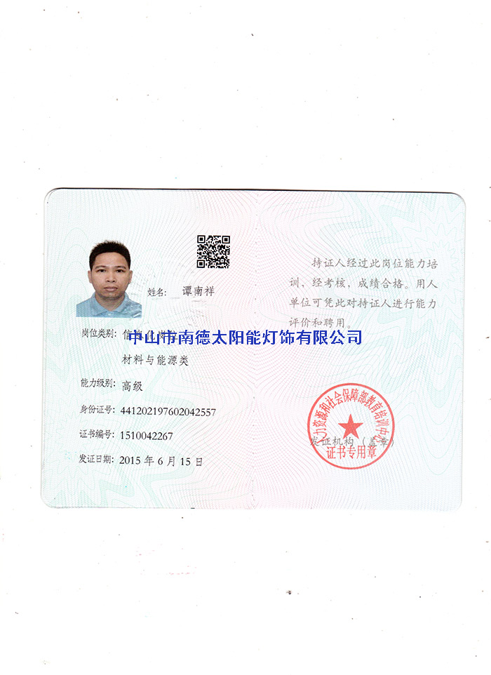 人员证书—中山市南德太阳能路灯厂家